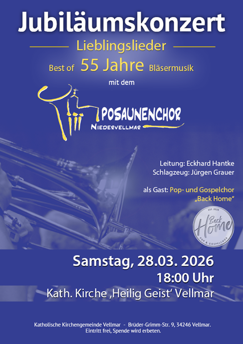 Sie können uns am Samstag, den 28. März 2026 um 18:00 Uhr in der Kath. Kirche 'Heilig Geist' in Vellmar hören - und sehen.